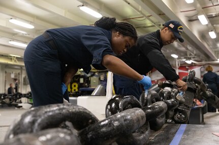ATLANTIC OCEAN - Boatswain's Mate Seaman Apprentice Diamond Cropper (left) and Boatswain's Mate Seaman Recruit Jakari Bobo, both assigned to deck department aboard the world's largest aircraft carrier, USS Gerald R. Ford (CVN 78), paint an anchor chain in the foc'sle, March 17, 2025. The Gerald R. Ford Carrier Strike Group is underway in the Atlantic Ocean completing integrated naval warfighting training. Composite Training Unit Exercise (COMPTUEX) is the Joint Force’s most complex integrated training event and prepares naval task forces for sustained high-end Joint and combined combat. Integrated naval training provides America’s civilian leaders and commanders highly-capable forces that deter adversaries, underpin American security and economic prosperity, and reassure Allies and partners. (U.S. Navy photo by Mass Communication Specialist Seaman Recruit Spencer Staggs)